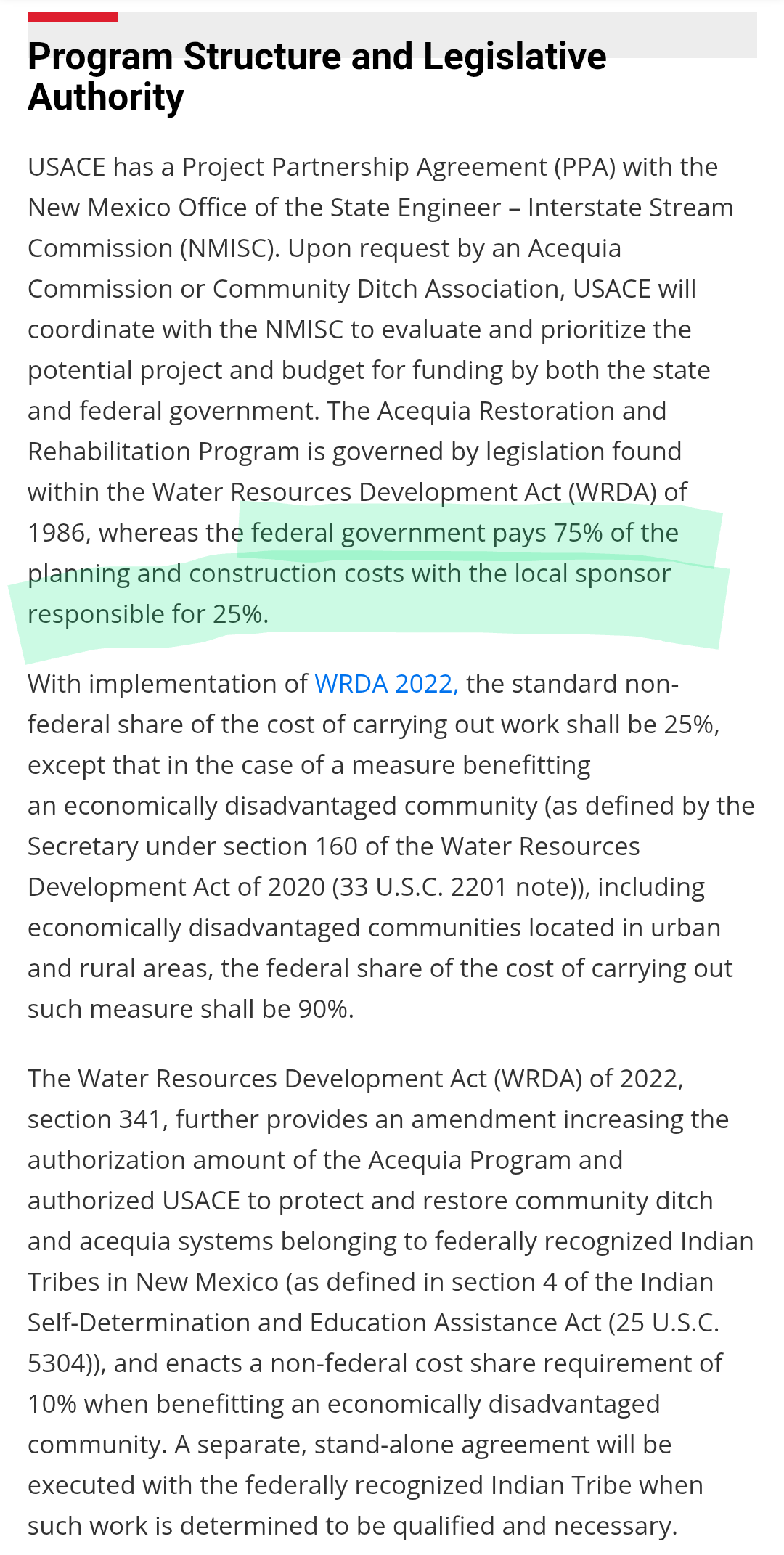 https://www.spa.usace.army.mil/Missions/Civil-Works/Acequia-Program/#:~:text=The%20USACE%20Acequia%20Restoration%20and%20Rehabilitation%20Program,the%20local%20sponsor%20is%20responsible%20for%2025%25.