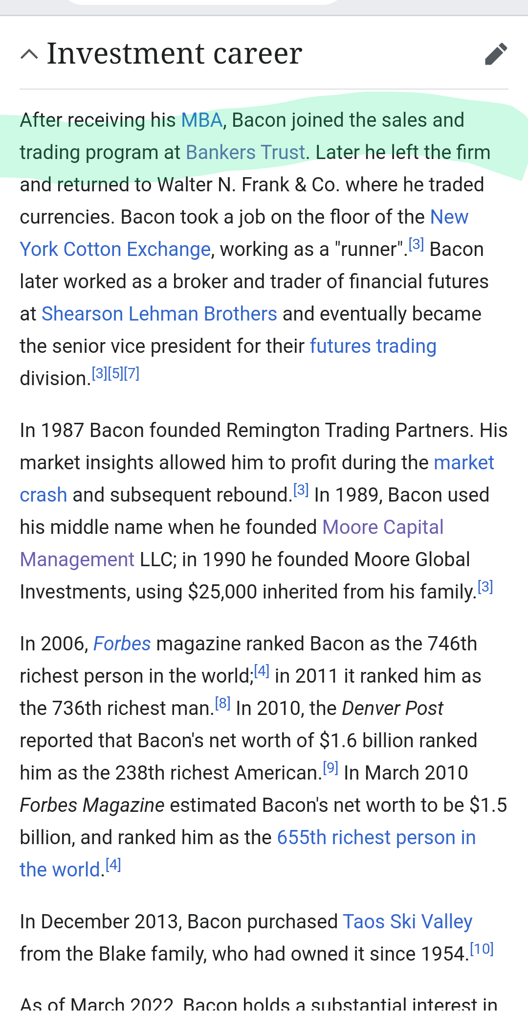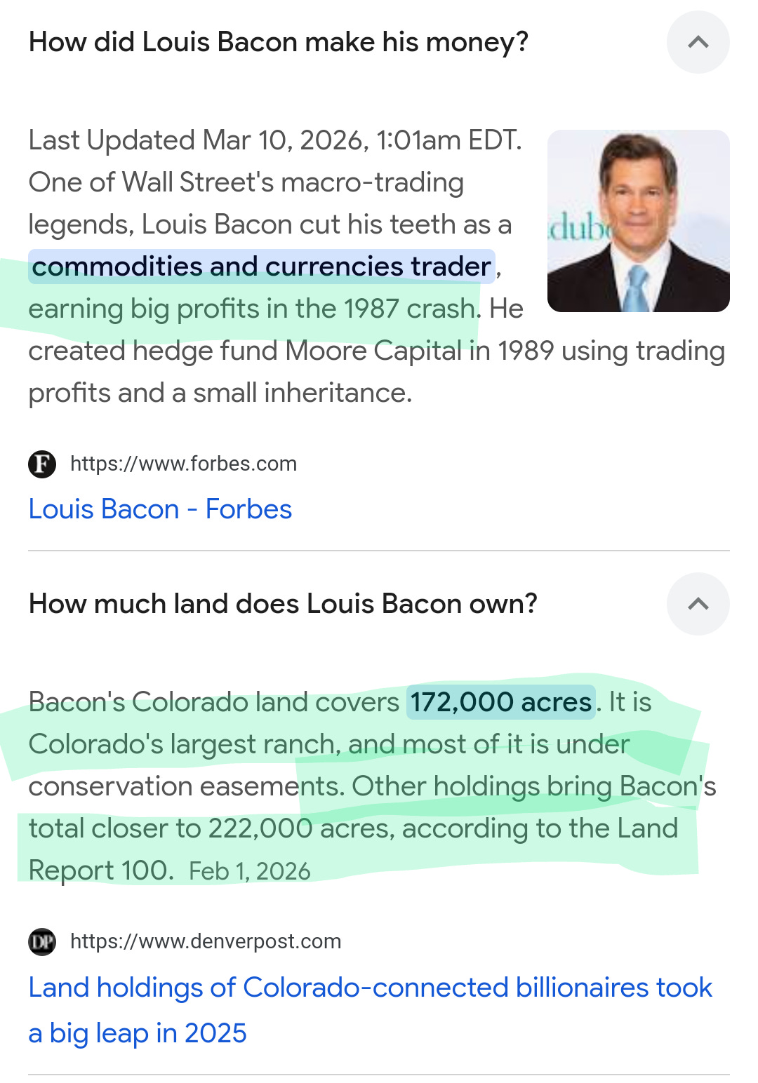 “Taos Ski Valley buyer Louis Bacon, founder and chief executive officer of the hedge fund company Moore Capital Management, is an avid conservationist. He has donated conservation easements on more than 100,000 acres in Colorado to the U.S. Fish and Wildlife Service.”